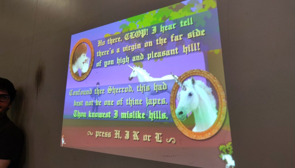 After lunch we gathered again within the studio. Yann pulled out a laptop, set up a projector, and a unicorn illuminated the wall — wonderful. The unicorn was the main character of the video game CLOP, where the main objective was to get the unicorn from one end of the track to the other using four buttons that control each leg independently. The game is primarily intended for one player but by using four giant controllers, each with one big button on them, the game became a more collaborative process. Therefore the group playing had to create a shared sense of rhythm in order to complete the game.