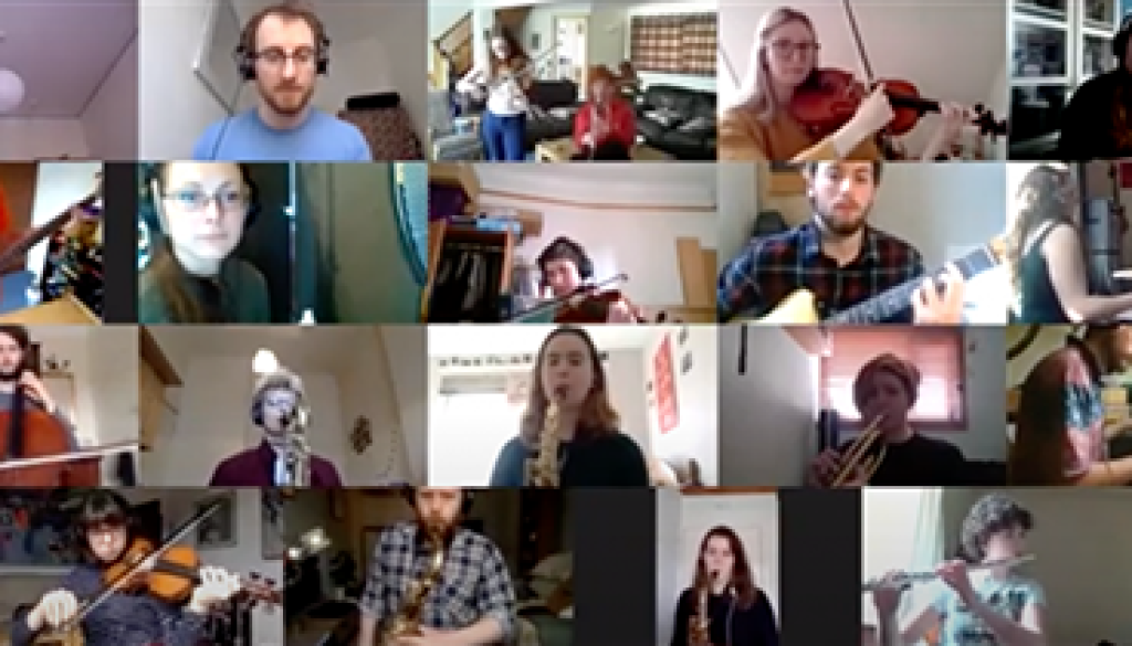 As well as rehearsing songs, the orchestra have also been experimenting with trying out different methods of improvisation over video call. A Tinderbox rehearsal in the Jazz Bar typically involves a session of ‘Suggesture’; a method of improvising, conducted using a series of hand gestures that was developed by conductor Mike Kearney. It’s been tricky to translate into a Zoom call, but we’ve been testing out different methods (some of which we showed at our Tinderbox Livestream!)